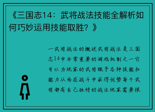 武将战法是《三国志14》中非常重要的游戏机制之一,它可以为玩家的武将赋予各种技能和能力,从而在战斗中获得优势。每个武将都有自己独特的战法,玩家需要根据武将的特点和战斗需求来选择合适的战法。本文将从随机8-20个方面对武将战法的使用技巧进行详细阐述。
