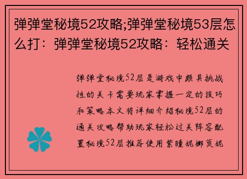 《弹弹堂3》地穴谜境是游戏中的一处剧情副本,玩家需要通过完成一系列解谜和战斗挑战才能通关。本攻略将详细介绍地穴攻略,帮助玩家顺利通关地穴谜境。